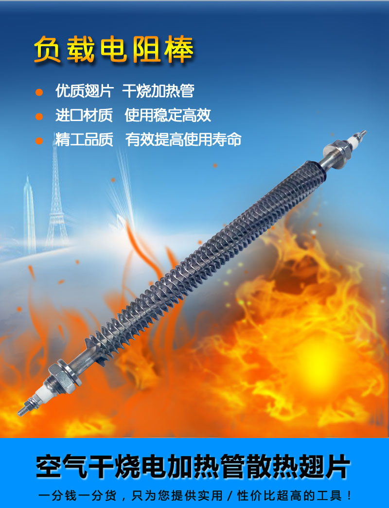 測試負(fù)載電阻棒采用優(yōu)質(zhì)不銹鋼、進(jìn)口氧化鏷粉、高電阻電熱合金絲、不銹鋼散熱片等材料,通過先進(jìn)的生產(chǎn)設(shè)備和工藝制作而成,翅片電加熱管可以安裝在吹風(fēng)管道中或其它靜止、流動空氣的加熱場合。它與普通加熱管相比,散熱面積擴(kuò)大了2~3倍,即翅片元件所允許的表面功率負(fù)荷是普通元件的3~4倍。由于元件的長度縮短,使得本身的熱損失減小,在相同的功率條件下,具有升溫快、發(fā)熱均勻、散熱性能好、熱效率高、使用壽命長、加熱裝置體積小,成本低等優(yōu)點(diǎn)。根據(jù)用戶要求進(jìn)行了合理的設(shè)計,便于安裝。產(chǎn)品在機(jī)械制造、汽車、紡織、食品、家電等行業(yè),尤其在空調(diào)器風(fēng)幕行業(yè)得到廣泛應(yīng)用。