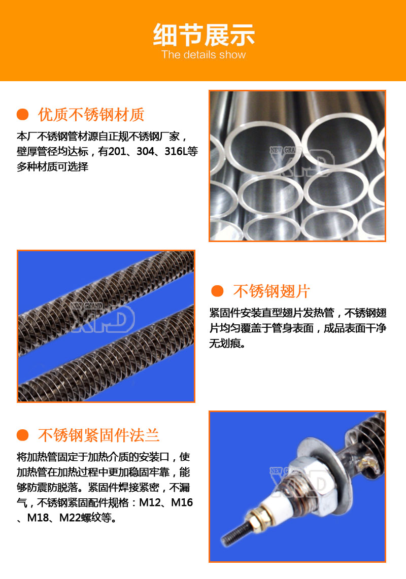 1.化工行業(yè)的化工物料升溫加熱、一定壓力下一些粉末干燥、化工過程及噴射干燥都要通過翅片電熱管來實(shí)現(xiàn)。