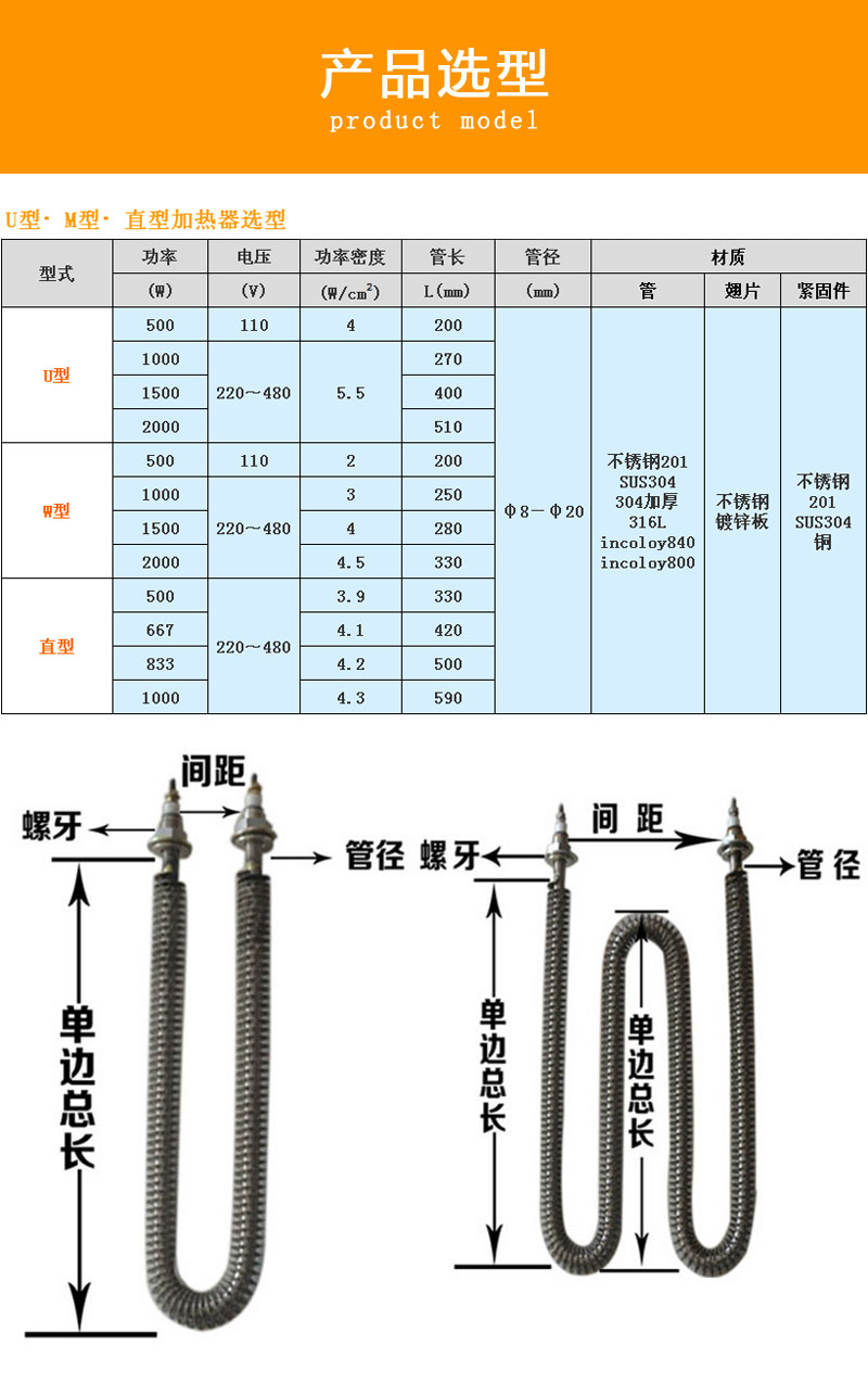 W型翅片空氣電加熱管采用優(yōu)質(zhì)不銹鋼、進(jìn)口氧化鏷粉、高電阻電熱合金絲、不銹鋼散熱片等材料,通過先進(jìn)的生產(chǎn)設(shè)備和工藝制作而成,翅片電加熱管可以安裝在吹風(fēng)管道中或其它靜止、流動(dòng)空氣的加熱場合。它與普通加熱管相比,散熱面積擴(kuò)大了2~3倍,即翅片元件所允許的表面功率負(fù)荷是普通元件的3~4倍。由于元件的長度縮短,使得本身的熱損失減小,在相同的功率條件下,具有升溫快、發(fā)熱均勻、散熱性能好、熱效率高、使用壽命長、加熱裝置體積小,成本低等優(yōu)點(diǎn)。根據(jù)用戶要求進(jìn)行了合理的設(shè)計(jì),便于安裝。產(chǎn)品在機(jī)械制造、汽車、紡織、食品、家電等行業(yè),尤其在空調(diào)器風(fēng)幕行業(yè)得到廣泛應(yīng)用。