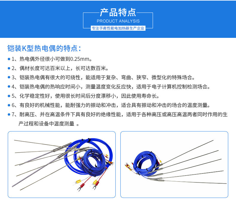 4、鎧裝熱電偶的熱響應(yīng)時間小,測量溫度變化反應(yīng)快,適用于電子計算機控制檢測場合。